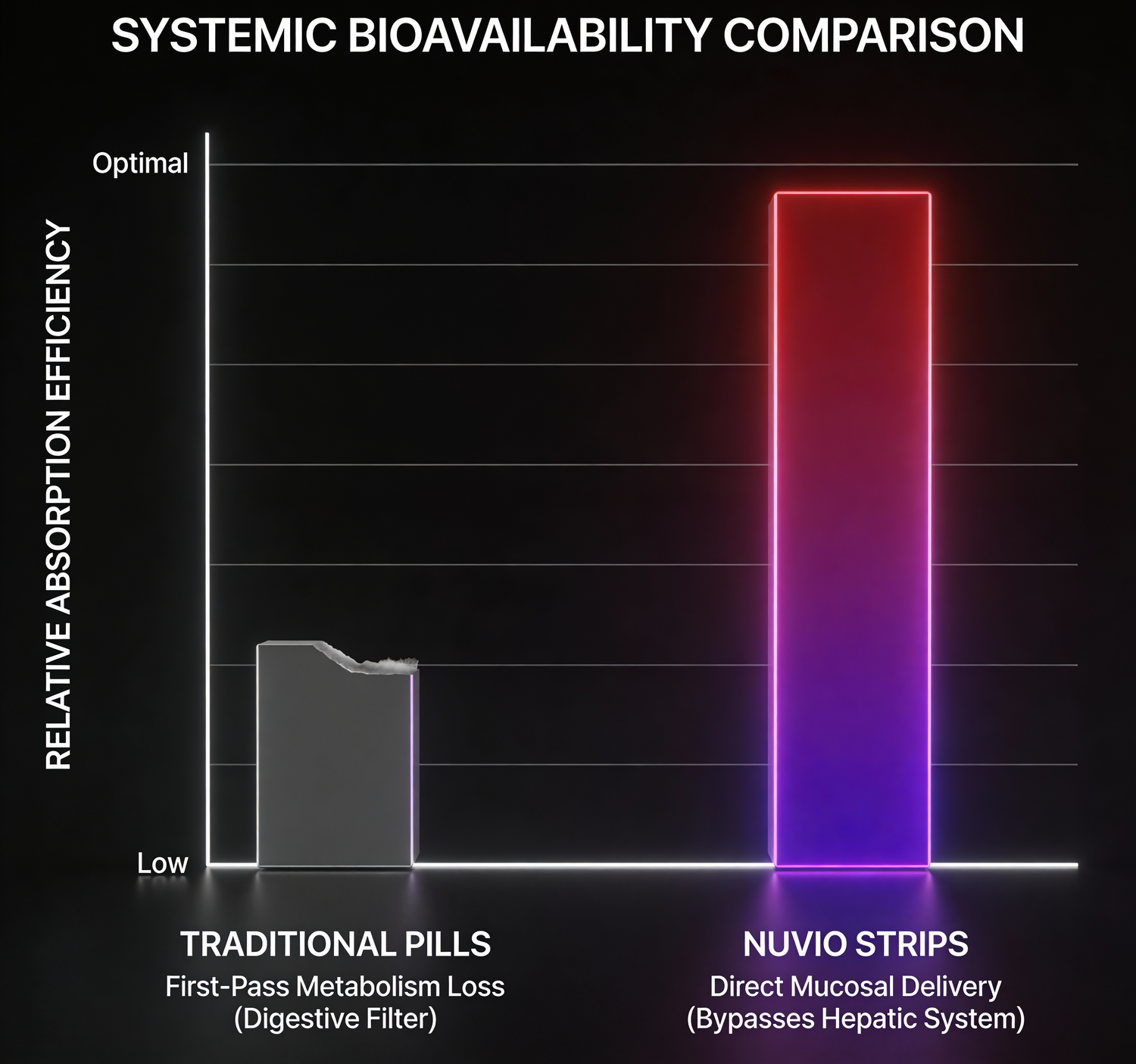 NUVIO strips bypass digestion entirely—delivering compounds directly through oral mucosa into your bloodstream. No liver filter. No acid breakdown. Just pure bioavailability in 10-15 minutes.