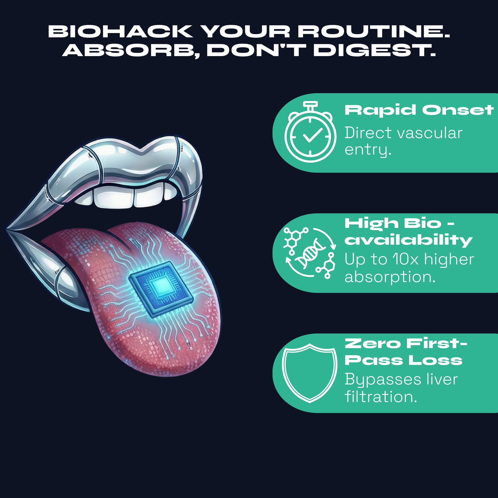 Melts in seconds. Active ingredients absorb directly through your mouth— bypassing your stomach for 3x faster results.
