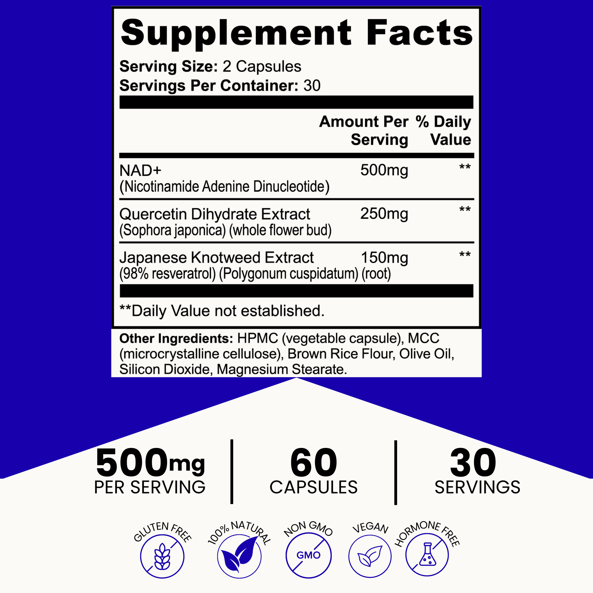 Our formula combines 500mg of pure NAD+ with synergistic ingredients like Quercetin (250mg) and Resveratrol (150mg) for enhanced antioxidant support and comprehensive anti-aging benefits. We use high-quality, bioavailable forms of each ingredient, vegetable capsules, and minimal fillers. Plus, our product is manufactured in certified facilities to ensure purity, potency, and safety in every bottle.